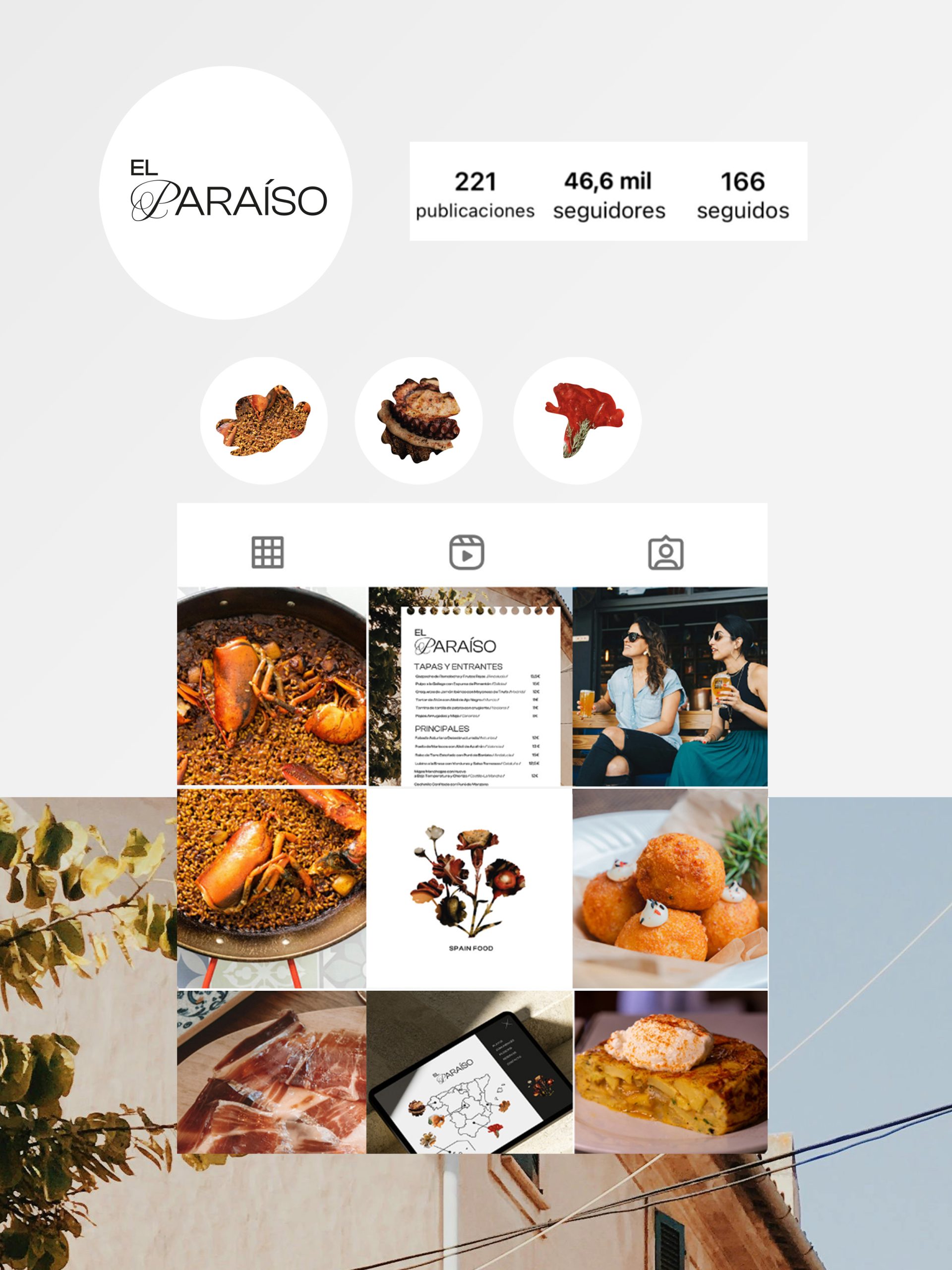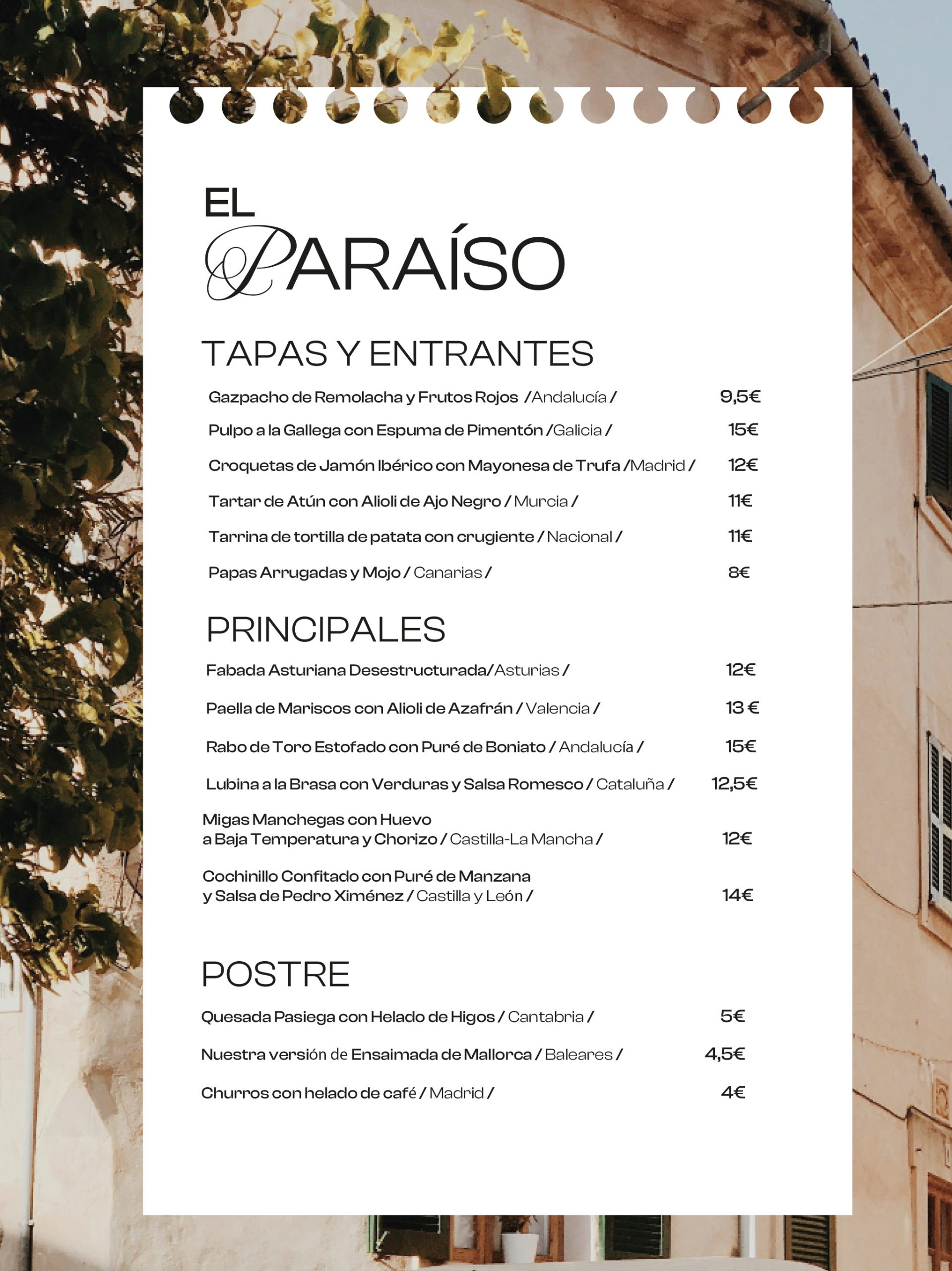 Nombre evocador: “El Paraíso” es un nombre que invita a disfrutar, a dejarse llevar por una experiencia sensorial. Asociado a la gastronomía, sugiere un lugar donde la comida es placer, cultura y descanso. El añadido «Spanish Food» refuerza el enfoque internacional, posicionando el restaurante como un escaparate de la cocina española auténtica.
